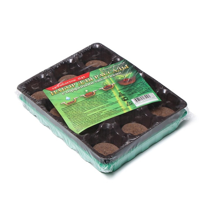 Набор для рассады: торфяная таблетка d = 4.1 см, 12 шт., кассета на 12 ячеек по 40 мл, поддон 20,5 × 17 см, зелёный, пластик, Экоторф