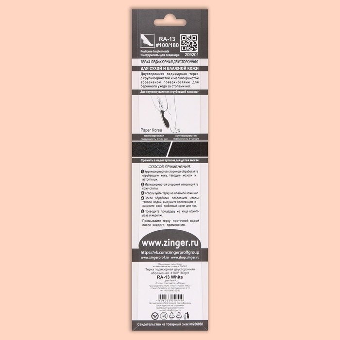 Тёрка для ног ZINGER, наждачная, двусторонняя, абразивность 100/180, 24 см, цвет белый, RA-13