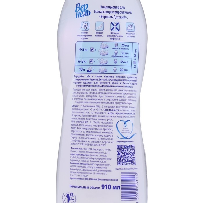 Концентрированный кондиционер для белья Вернель Детский предназначен для стирки детского белья, а также одежды людей с чувствительной кожей и склонных к аллергии.