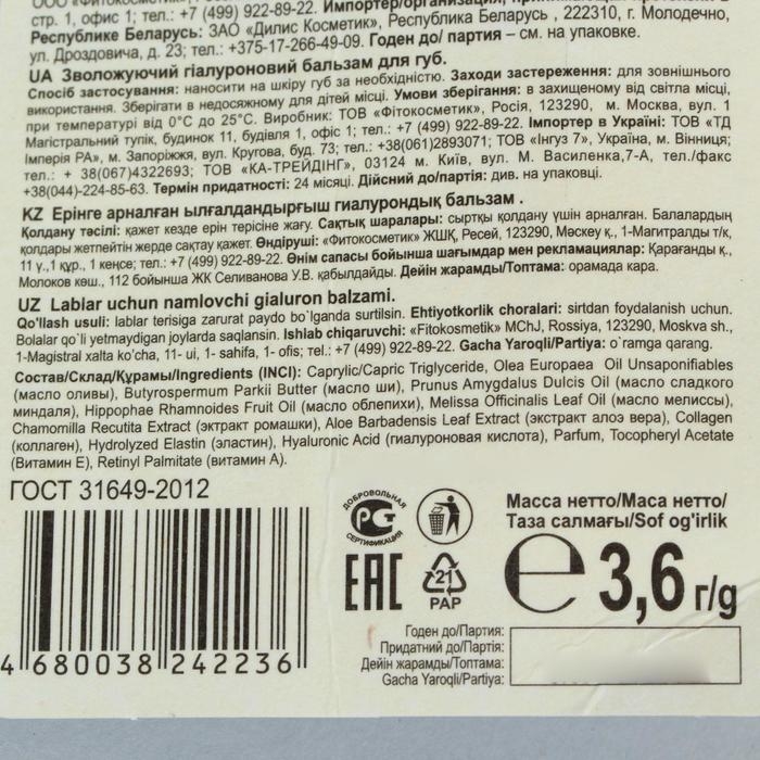 Бальзам для губ Beauty Visage увлажняющий гиалуроновый, 3,6 г
