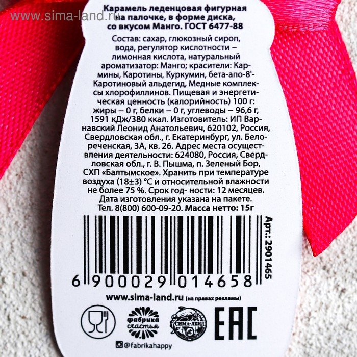 Состав: сахар, патока, вода, регулятор кислотности – лимонная кислота, натуральный ароматизатор «Манго», натуральные красители: Б-каротин, кармин, куркумин, Б-апокаротиновый альдегид.