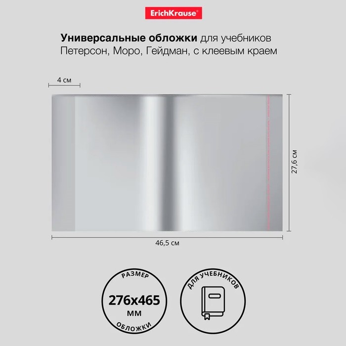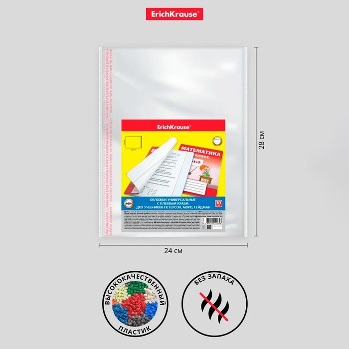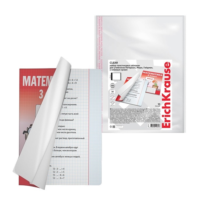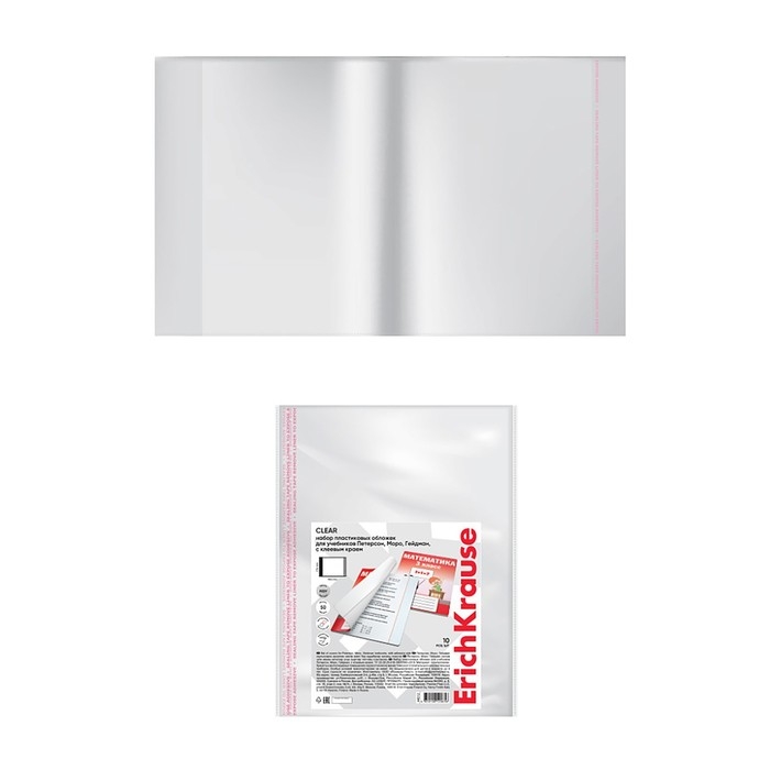 Набор обложек ПП 10 шт, 276 х 465 мм, 50 мкм, ErichKrause, Fizzy Clear, для учебников Петерсон, Моро, Гейдман, с клеевым краем, с тиснением, универсальная