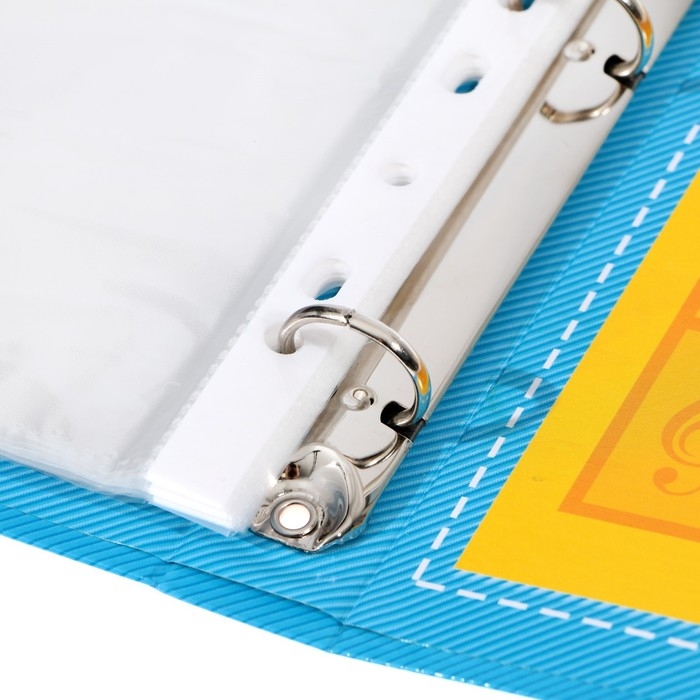 В набор входит: папка на кольцах, 10 односторонних листов-разделителей (мелованная бумага 157 гр/кв.м) и 10 файлов. Обложка выполнена из переплетного картона плотностью 1,5 мм, внутри есть четыре кольца, на которые следует цеплять файлы.