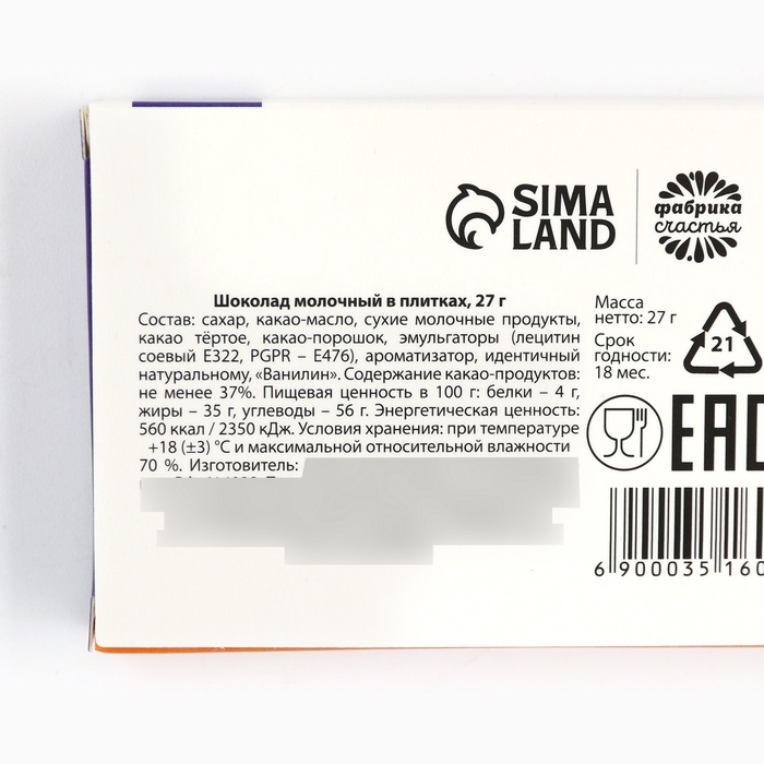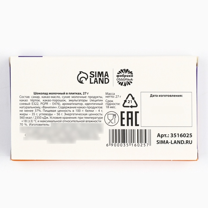 Состав: сухое цельное молоко, какое тёртое, масло какао, сухая молочная сыворотка, обезвоженный молочный жир, сахар, эмульгатор: соевый лецитин, ароматизатор, идентичный натуральному «Ванилин».