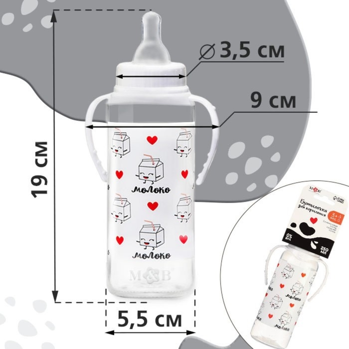 Бутылочка для кормления «Люблю молоко», классическое горло, с ручками, 250 мл., от 3 мес., цвет белый