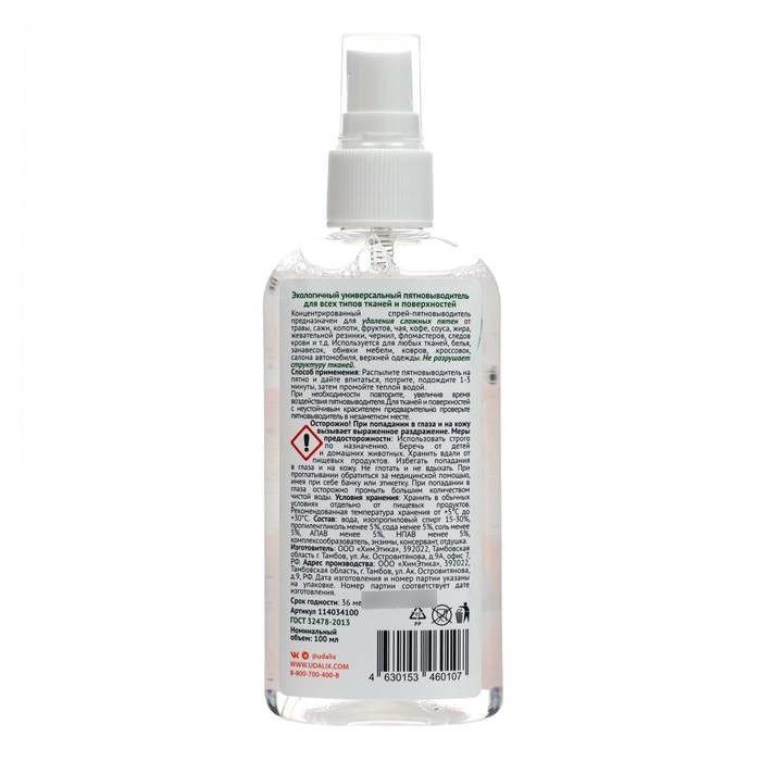 Udalix Professional - пятновыводитель для удаления сложных пятен с любых тканей и поверхностей. Предназначен для удаления пятен от травы, фруктов, кофе, чая, соуса, сажи, жира, копоти, жевательной резинки, фломастеров, чернил, следов крови и пр.