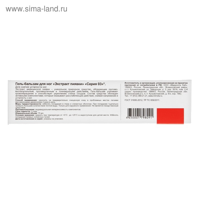Гель-бальзам «Экстракт пиявки» для ног, 75 мл