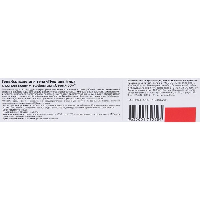 Состав: aqua, Propylene Glycol, Glycerin, Glycine Soya (Soybean) Oil, Carbоmer, PEG-40 Hydrogenated Castor Oil, Cinnamomum Сamphora, Salvia Оfficinalis Oil (эфирное масло шалфея лекарственного), Rosmarinus Officinalis Flower Oil (эфирное масло розмарина), Abies Sibirica Oil (эфирное масло пихты), Phenoxyethanol, Ethylhexylglycerin, Capsicum Annuum Extract (экстракт красного перца), Bee Venom (пчелиный яд), Etilnikotinat.