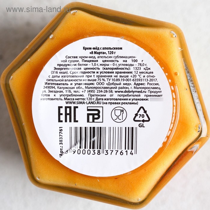 Мёд кремовый с апельсином «8 Марта», 120 г.