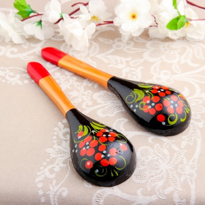 Традиционные элементы Хохломы — ягоды рябины и земляники, цветы и листья, птицы, рыбы и звери.