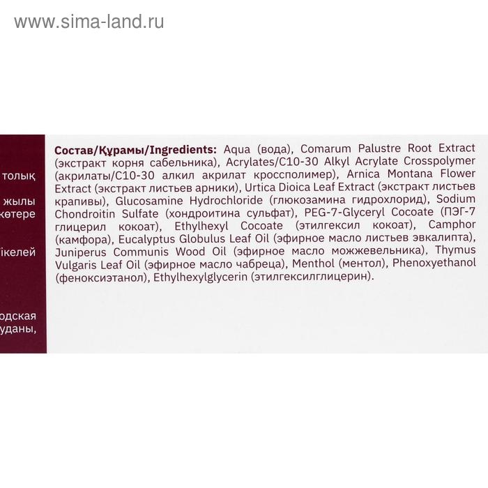 Состав: Aqua, Comarum Palustre Root Extract, Acrylates/ C10-30 Alkyl Acrylate Crosspolymer, Arnica Montana Flower Extract, Urtica Dioica Leaf Extract, Glucosamine Hydrochloride, Sodium Chondroitin Sulfate, PEG-7-Glyceryl Cocoate, Ethylhexyl Cocoate, Camphor, Eucalyptus Globulus Leaf Oil, Juniperus Communis Wood Oil, Thymus Vulgaris Leaf Oil, Menthol, Phenoxyethanol, Ethylhexylglycerin.