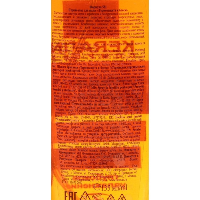 Спрей-уход для волос Floresan "Термозащита и блеск", 135 мл