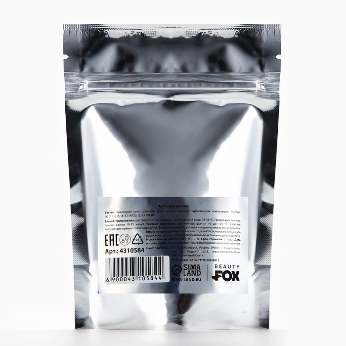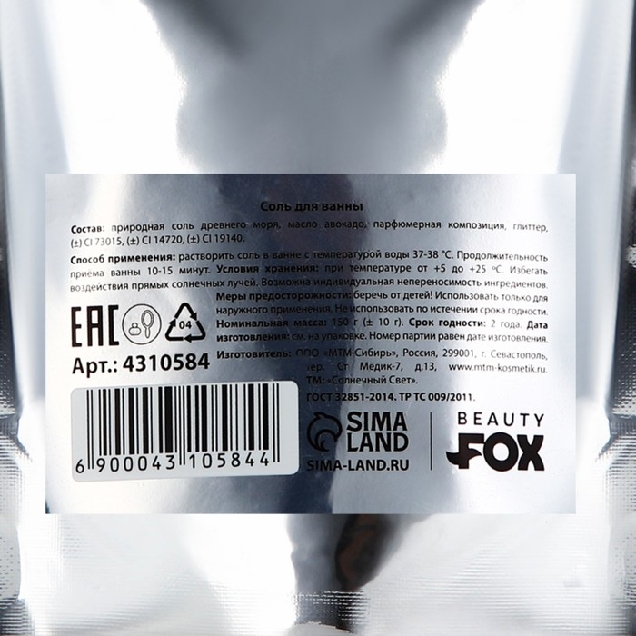 Состав: соль морская природная, витамин Е, витамин А, витамин С, ароматическая композиция, пищевой краситель, глиттер.