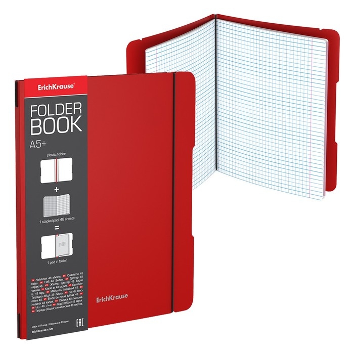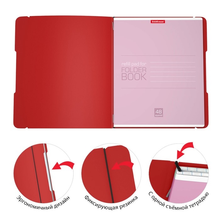 Тетрадь 48 листов в клетку, ErichKrause FolderBook, съёмная пластиковая обложка, на резинке, блок офсет 100% белизна, красная