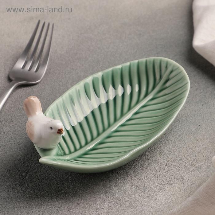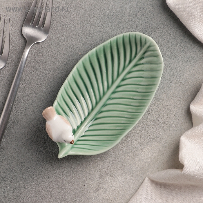 Блюдо керамическое сервировочное «Птичка на листочке», 15,5×8,5 см, цвет зелёный