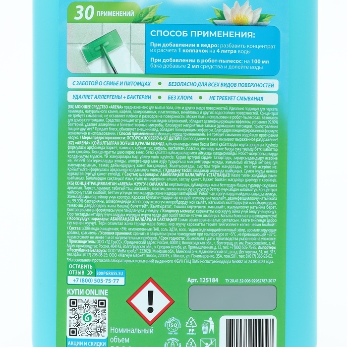 Моющее cредство «Arena» предназначено для мытья и ухода за полом и другими видами моющихся поверхностей. Благодаря безопасной формуле идеально подходит для паркета, ламината, натурального камня, кафеля, лакированных и других водостойких поверхностей. Придает блеск, не оставляет разводов и налета. Обладает полирующим эффектом, обновляет внешний вид. Экономичен благодаря концентрированной формуле. Нейтрализует неприятные запахи, ароматизирует.