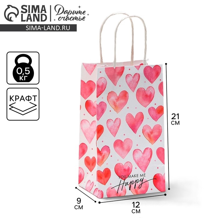 Пакет подарочный крафтовый, упаковка, «Happy», 12 х 21 х 9 см