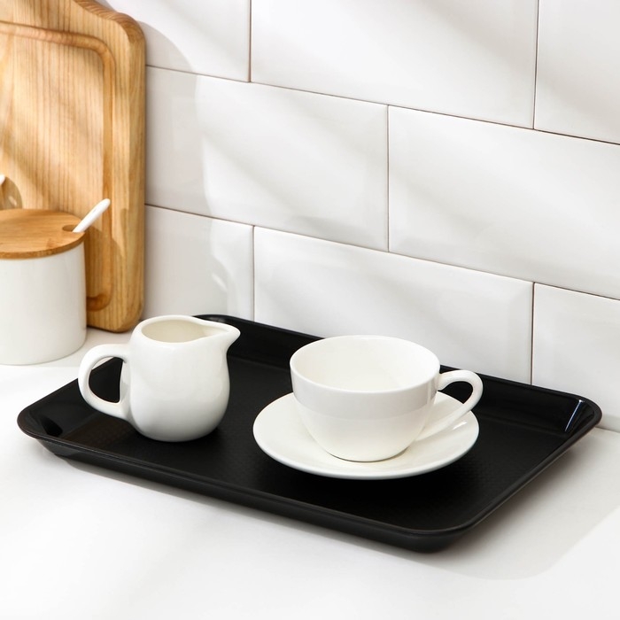 - Высокие бортики не позволяют посуде соскользнуть, а всё случайно пролитое или просыпанное останется на подносе;
