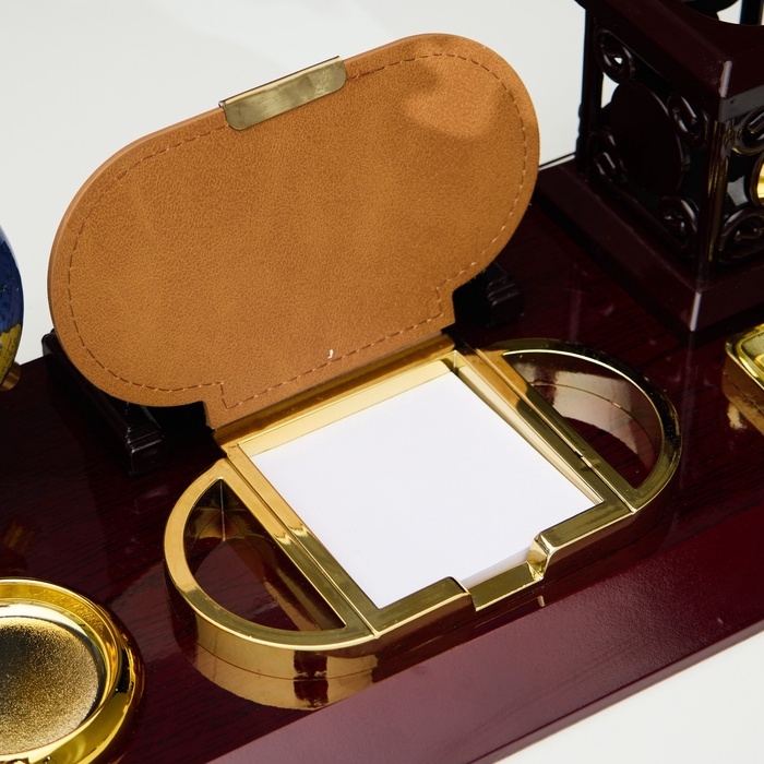 Компактный настольный набор поможет избежать хаоса на рабочем месте. Храните в нём канцелярские принадлежности или другие мелочи, чтобы правильно организовать пространство. К тому же изделие имеет минималистичный дизайн и выполнено под дерево, поэтому оно украсит собой любое место как декоративный элемент.