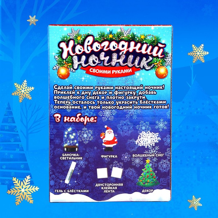 Набор поможет вам вместе с малышом увлекательно провести время и создать настоящий ночник своими руками. Декорируйте содержимое изделия и украшайте его с помощью геля с блёстками. И хотя это совсем не трудно, крохе придётся быть усидчивым и внимательным, совсем как взрослому!