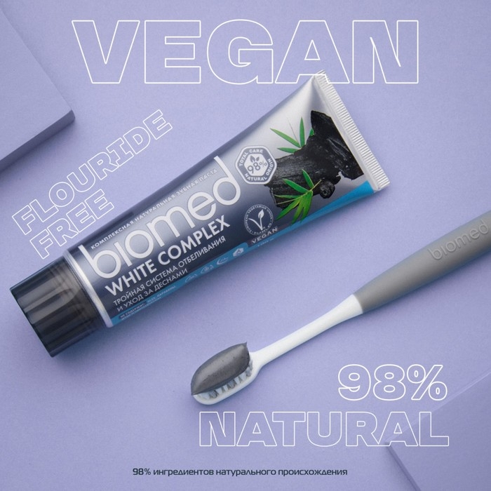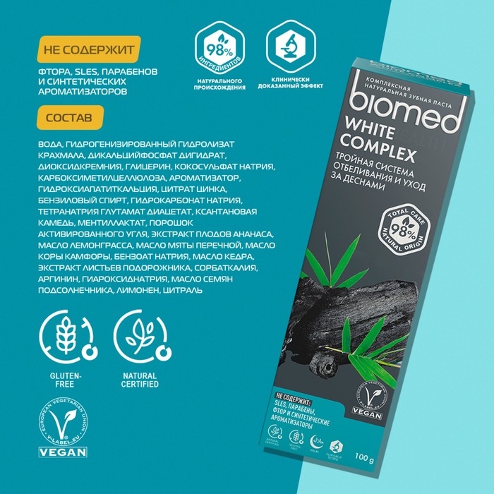 Натуральная зубная паста Biomed White Complex с тройной системой отбеливания за 4 недели применения осветляет зубы до 1 тона. На 98% состоит из компонентов природного происхождения: