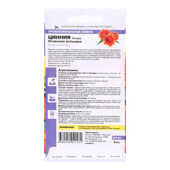 Семена цветов Цинния Захара "Огненная вспышка", ц/п, 6 шт