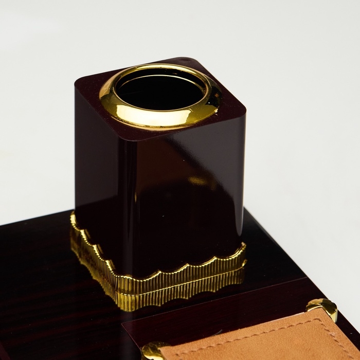 Компактный настольный набор поможет избежать хаоса на рабочем месте. Храните в нём канцелярские принадлежности или другие мелочи, чтобы правильно организовать пространство. К тому же изделие имеет минималистичный дизайн и выполнено под дерево, поэтому оно украсит собой любое место как декоративный элемент.