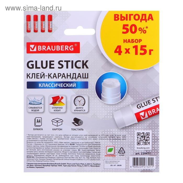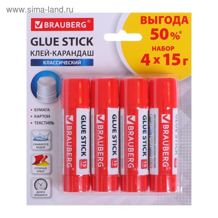 Клей-карандаш PVP 15 г BRAUBERG ВЫГОДНАЯ УПАКОВКА, 4 штуки, блистер