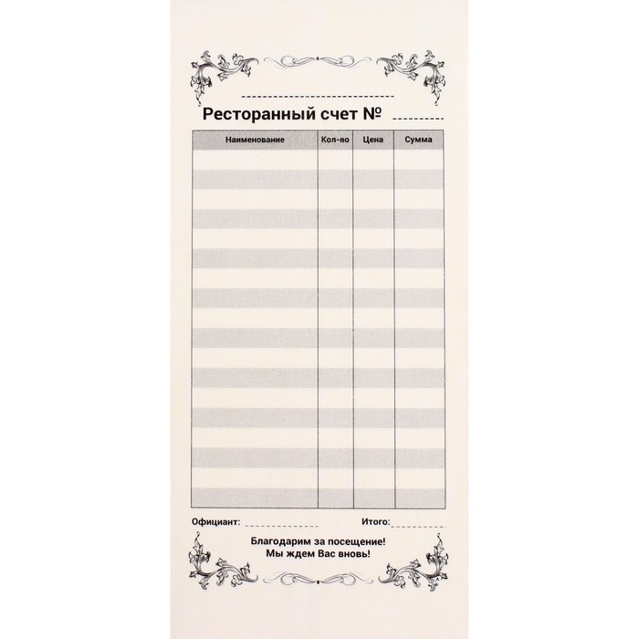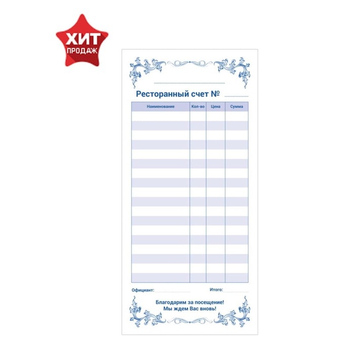 Бланк двухслойный самокопирующийся "Ресторанный счет". Размер бланка 97 х 200 мм. Бланки изготовлены из офсетной бумаги и склеены в книгу по 50 листов, упакованную в пленку.