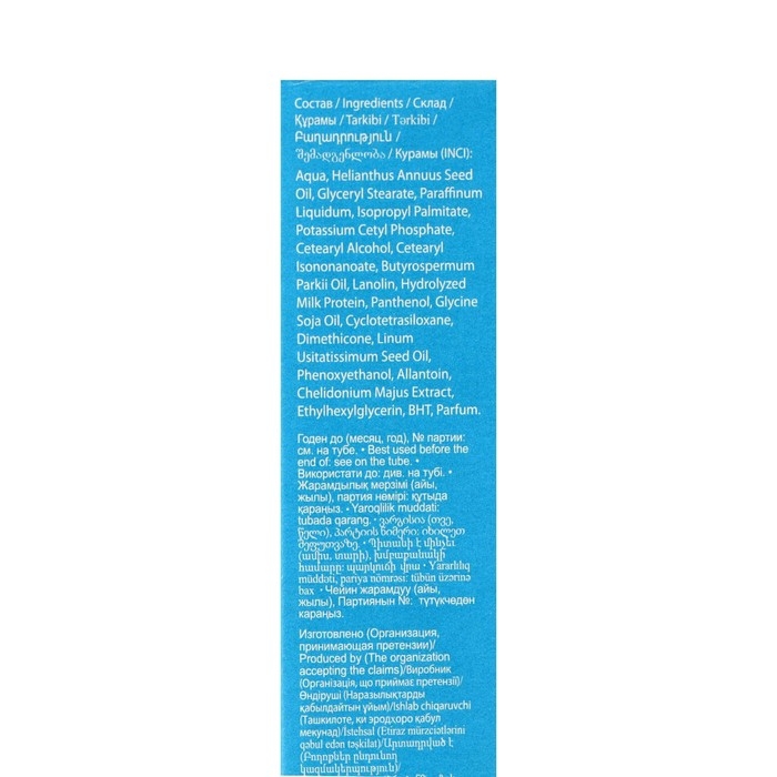 Легкий, нежный крем содержит в своем составе активные компоненты - протеин молока, натуральное растительное масло, витамин F, провитамин В5, ланолин, экстракт чистотела, аллантоин.