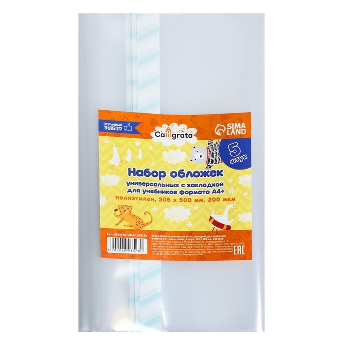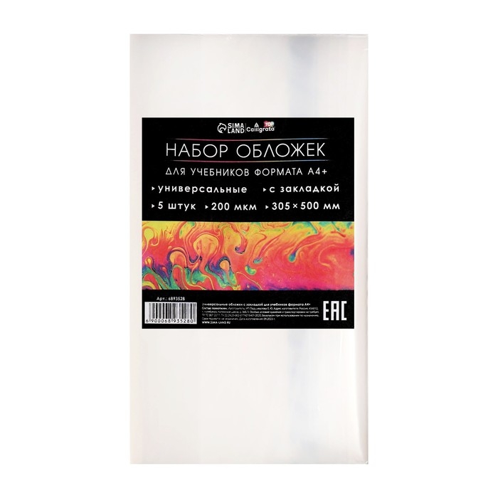 Набор обложек ПЭ 5 штук, 305 х 500 мм, 200 мкм, для учебников формата А4+, универсальная, с закладкой, МИКС