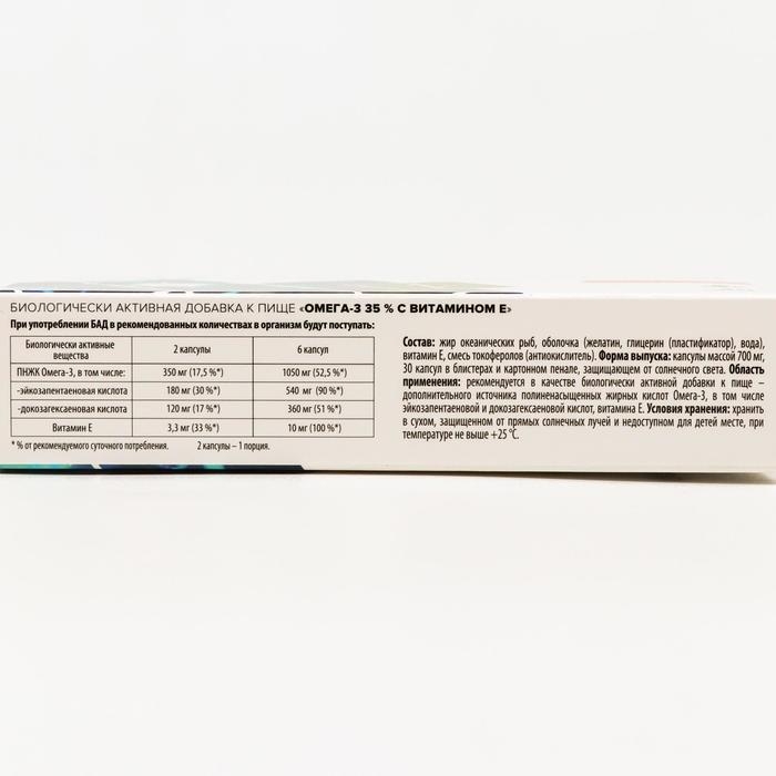Биологически активная добавка к пище «ОМЕГА-3 35 % с витамином Е» является дополнительным источником полиненасыщенных жирных кислот (ПНЖК) Омега-3, в том числе эйкозапентаеновой и докозагексаеновой кислот, и витамина Е. Содержание биологически активных веществ в составе продукта нормализовано.