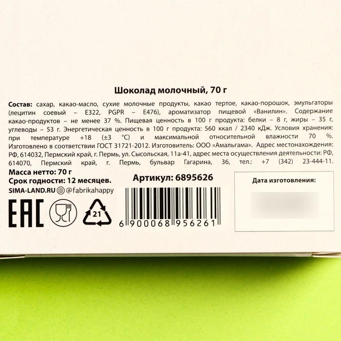 Состав: сахар, какао-масло, сухие молочные продукты, какао тертое, какао-порошок, эмульгаторы (лецитин соевый – Е322, PGPR – Е476), ароматизатор пищевой «Ванилин». Содержание какао продуктов не менее 37 %.