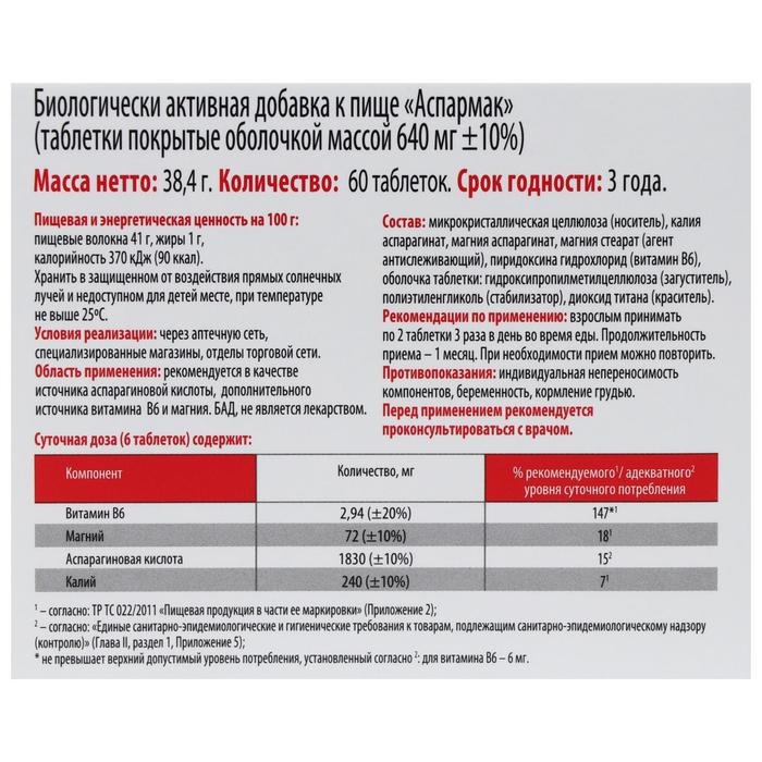 Аспармак является дополнительным источником калия, магния, аспарагиновой кислоты и витамина B6, которые оказывают многонаправленное действие на организм – в частности, на сердечно-сосудистую и нервную системы.