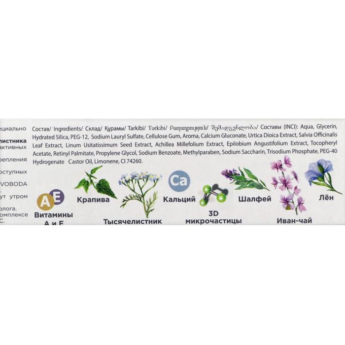 Зубная паста SVOBODA фитокомплекс содержит специально подобранный комплекс целебных трав. Экстракты иван-чая, льна, шалфея, крапивы и тысячелистника заботятся о здоровье десен, укрепляя и питая их комплексом активных веществ. Соединение кальция - источник кальция, необходимого для укрепления ослабленной эмали. 3D Микрочастицы заботятся о чистоте зубов в самых труднодоступных местах. Витамины Е и А, входящие в состав зубной пасты SVOBODA фитокомплекс известны своим антиоксидантным действием.