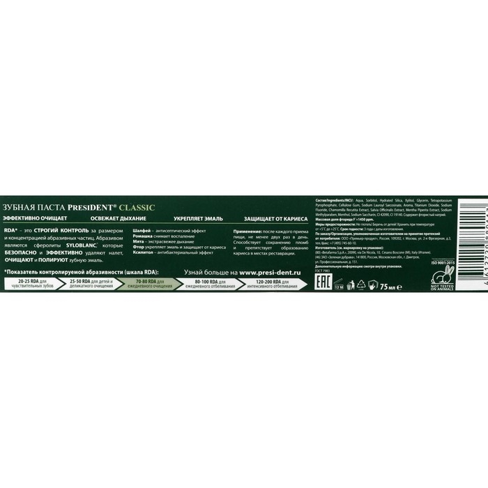 Инновационные разработки и богатый опыт ведущих итальянских и российских специалистов PRESIDENT воплотились в комплексном подходе к гигиене полости рта и системе контролируемой абразивности зубных паст (RDA). Показатель абразивности RDA — это строгий контроль за размером и концентрацией абразивных частиц. Именно показатель RDA помогает выбрать подходящую зубную пасту, которая справится со своей задачей и позволит избежать нежелательных эффектов, таких как возникновение повышенной чувствительности зубов, пожелтение эмали от употребления окрашивающей пищи или курения, а также скапливание бактериального налёта. Контроль уровня абразивности зубной пасты достигается за счёт использования уникального компонента SYLOBLANC®, мельчайшие сферолиты которого безопасно и эффективно удаляют налёт, очищают и полируют зубную эмаль.