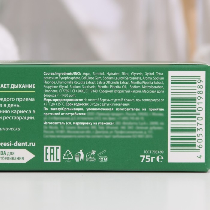 Состав: Aqua, Sorbitol, Hydrated Silica, Xylitol, Glycerin, Tetrapotassium Pyrophosphate, Cellulose Gum, Sodium Lauroyl Sarcosinate, Aroma, Titanium Dioxide, Sodium Fluoride, Chamomilla Recutita Extract, Salvia Officinalis Extract, Mentha Piperita Extract, Sodium Methylparaben, Menthol, Sodium Saccharin, CI 42090, CI 19140. Содержит фтористый натрий. Массовая доля фторида F¯=1450 ppm.