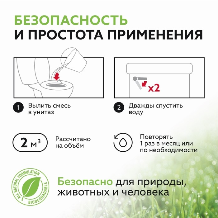 Применение: размешать средство в ведре воды и вылить в туалет. Дважды спустить воду.