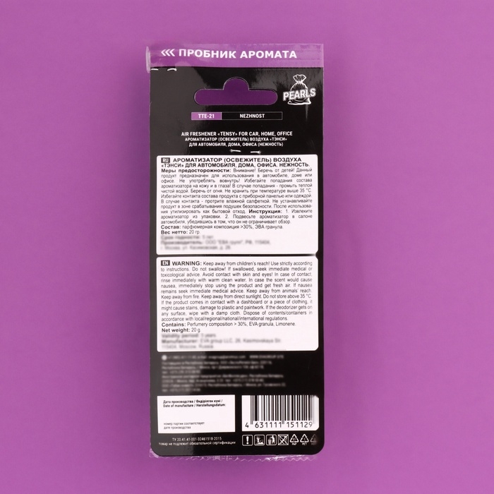 В подвесном ароматизаторе Tensy Нежность чувствуется насыщенный и яркий цветочно-фруктовый запах с кислинкой смородины и груши и нотками ириса и жасмина, который дополняется цитрусовым настроением в сочетании со сладостью ванили, пачули и пралине. Для создания данной ароматической композиции используются только высококачественные парфюмерные отдушки из Франции.