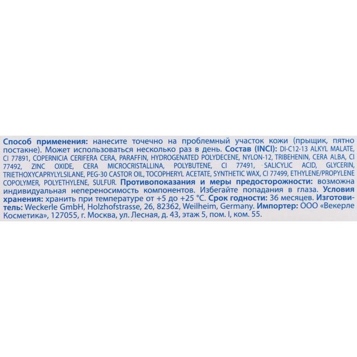 Способ применения: нанесите точечно на проблемный участок кожи (прыщик, пятно постакне). Может использоваться несколько раз в день.
