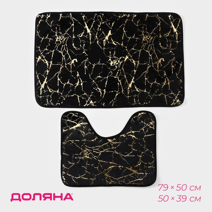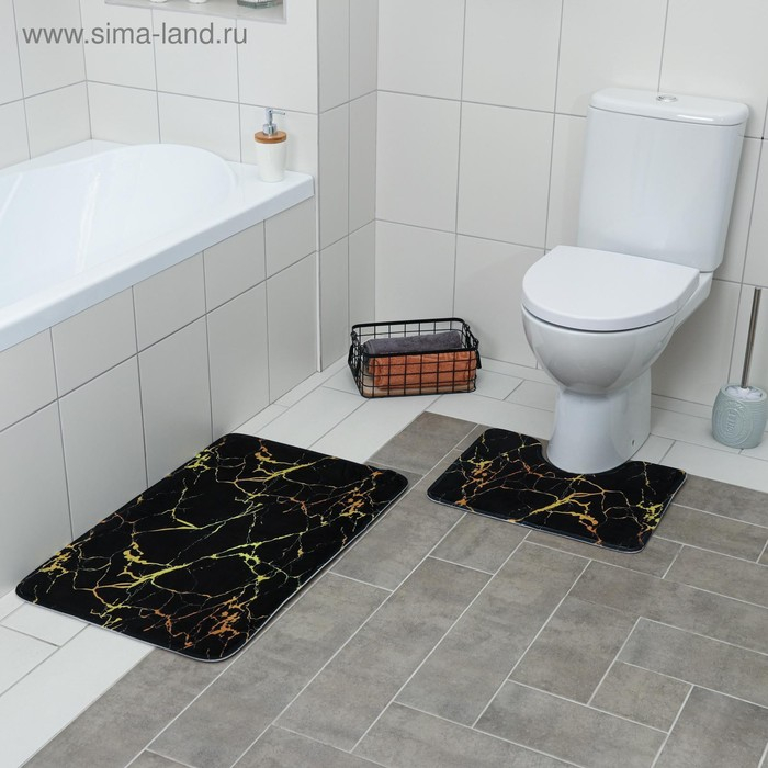 Коврики для ванной и туалета Доляна «Мрамор», 2 шт: 79×50 см, 50×39 см, цвет чёрный