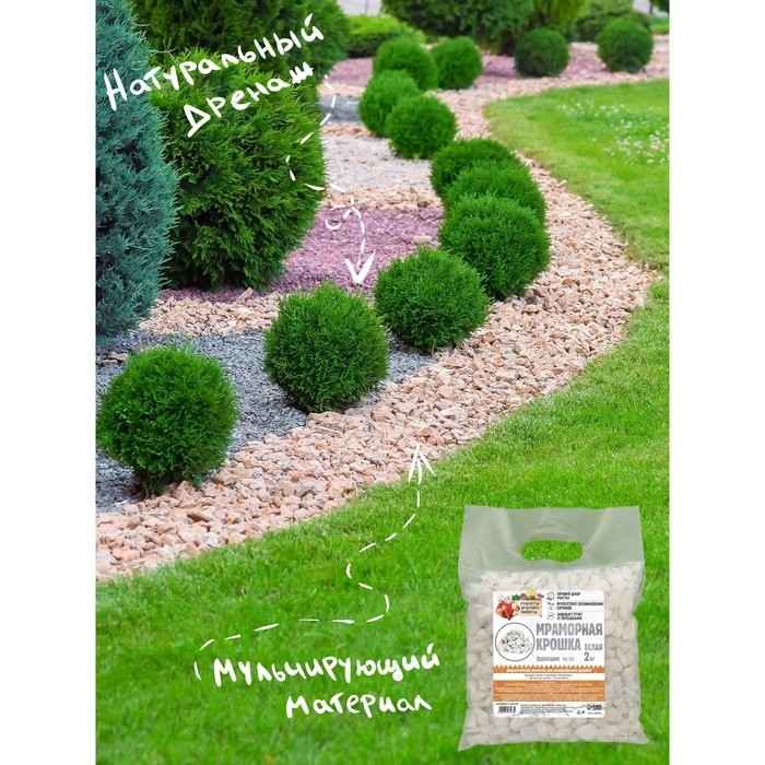Помимо декоративных свойств, мраморная крошка используется в качестве мульчирующего и дренажного материала. Мульчирование мраморной крошкой позволяет уменьшить перегрев земли и поддерживать оптимальный уровень влажности и рыхлости почвы. Мраморный щебень – эффективный элемент дренажной системы. Материал способен отвести излишки воды, тем самым избежать подтапливание, заболачивание и предупредить гниение корней растений.