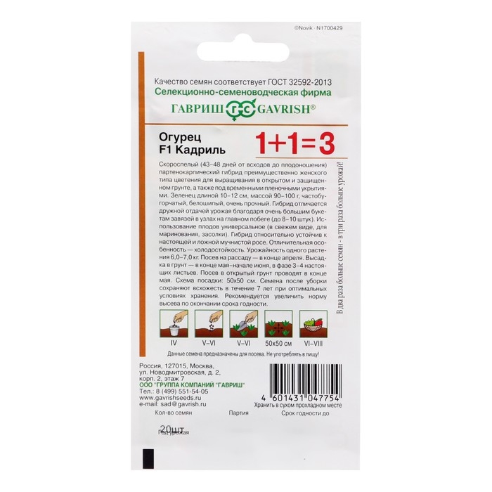 Семена Огурец "Кадриль", F1, корнишон, серия 1+1, 20 шт