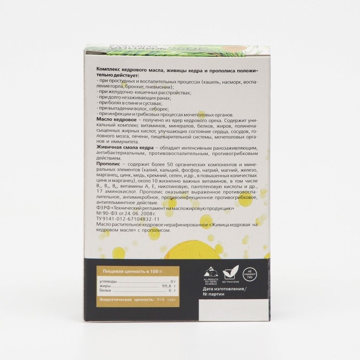 Состав: масло кедровое нативное первого механического прессования – 50%, живица кедровая нативная подсочка – 30%, прополис нативный пчелиный – 10%, мицеллы биовытяжек кордицепса –10%.