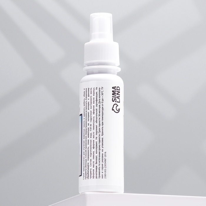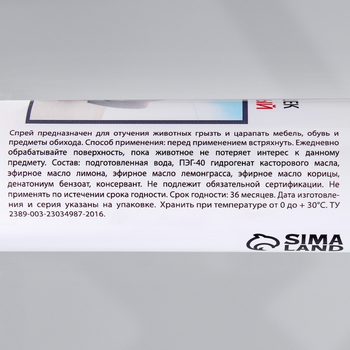Спрей предназначен для отучения животных грызть и царапать мебель, обувь и предметы обихода. Способ применения: перед применением встряхнуть. Ежедневно обрабатывайте поверхность, пока животное не потеряет интерес к данному предмету. Состав: подготовленная вода, ПЭГ-40 гидрогенат касторового масла, эфирное масло лимона, эфирное масло лемонграсса, эфирное масло корицы, денатониум бензоат, консервант. Не подлежит обязательной сертификации. Не применять по истечению срока годности. Срок годности 36 месяцев.