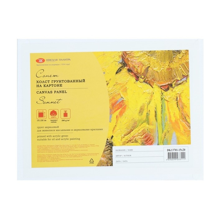 Холст на картоне 15 х 20 см, 100% хлопок, 280 г/м2, толщина3 мм, мелкое зерно