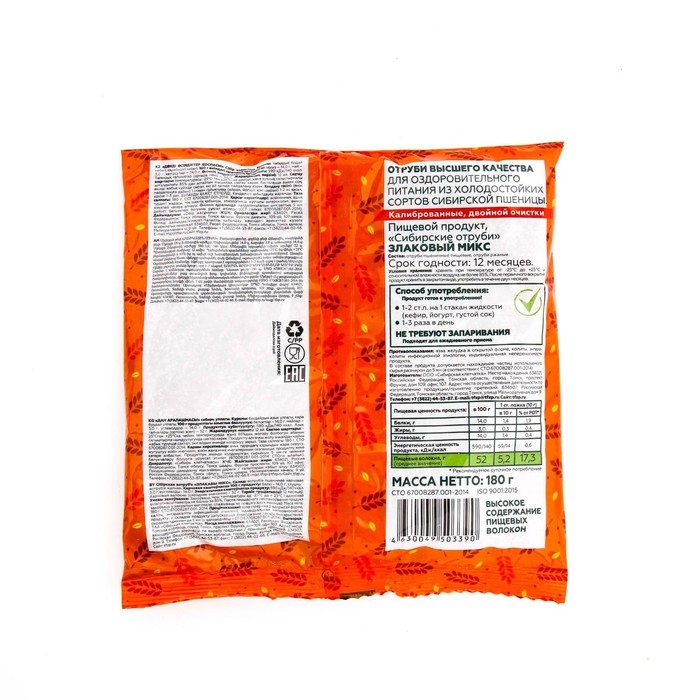 Отруби Сибирские "Злаковый микс". Рекомендуются как профилактическое и оздоровительное средство, необходимое для полноценной работы кишечника, снижения холестерина в крови, очистки пищеварительного тракта от шлаков и токсинов.