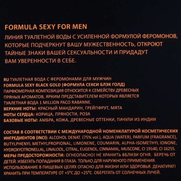 Туалетная вода мужская с феромонами Formula Sexy Black Gold, 100 мл (по мотивам 1 Million (P.Rabanne)