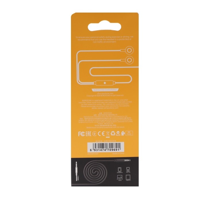 Наушники Borofone BM36 Acura, вакуумные, микрофон, Jack 3.5 мм, кабель 1.2 м, чёрные