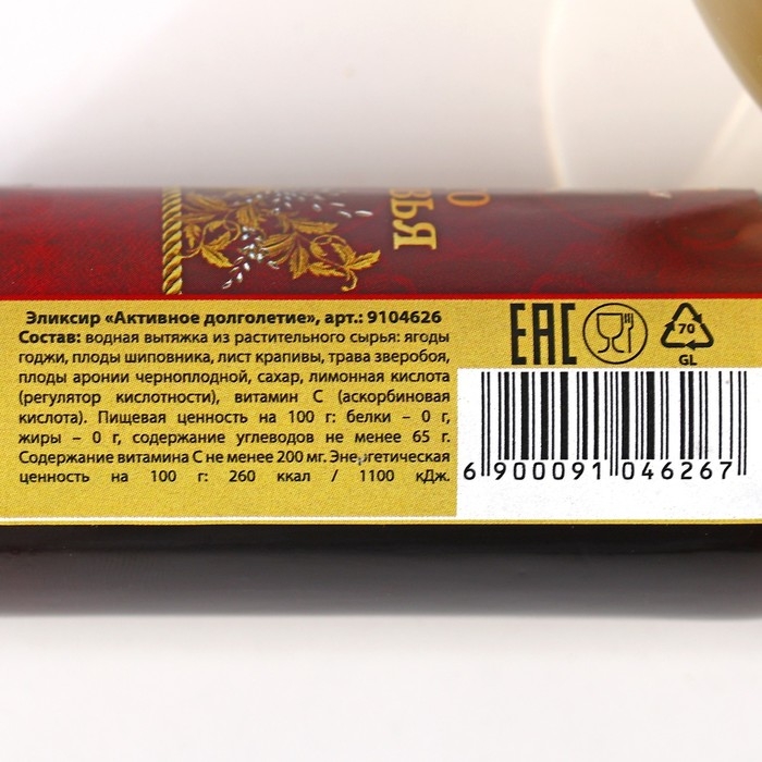 Состав: ягоды годжи, плоды шиповника, лист крапивы, трава зверобоя, плоды аронии черноплодной, сахар, лимонная кислота, витамин С.
